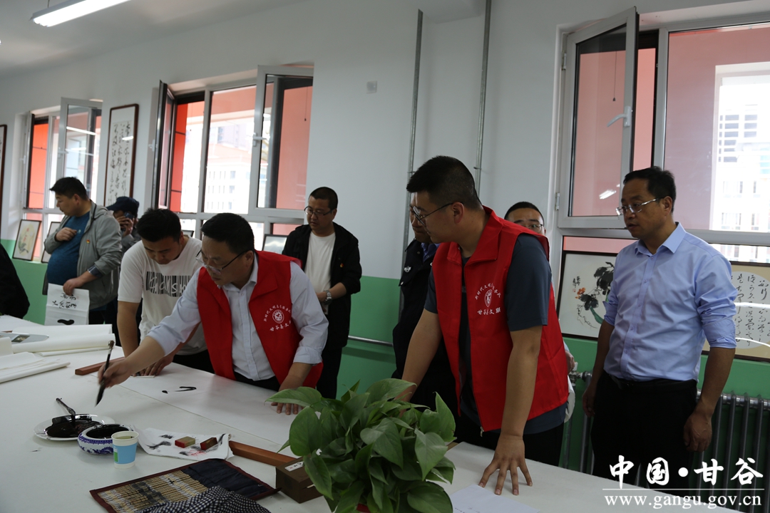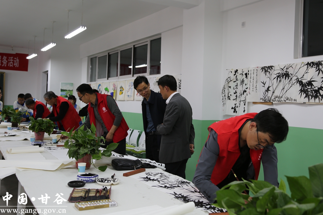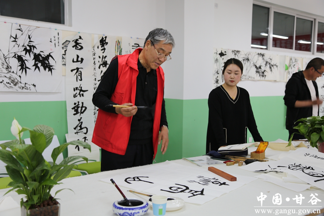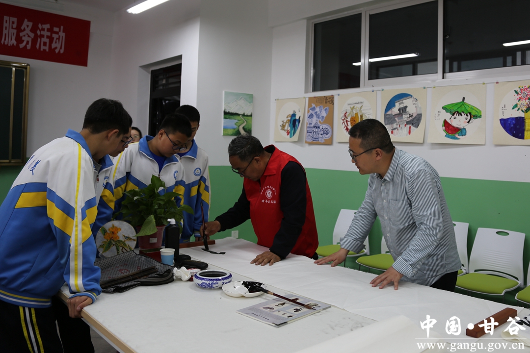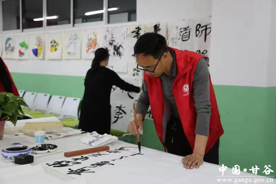 县文联主席门鸿斌说,近年来,甘谷县文联和各文艺家协会广泛组织文艺工作者深入火热生活、参与志愿服务,为人民群众送去丰富的精神食粮,文艺志愿服务逐渐成为一种社会新风尚。我们组织10余名书画艺术家走进西城区九年制学校,开展文艺志愿服务活动,和学校的各位老师共同交流,共同学习,共同提高,给孩子们展示书画艺术的魅力,引导孩子们传承弘扬中华民族优秀传统文化,培养学生爱国主义情怀,陶冶学生情操,丰富校园文化生活,也希望各位老师能以此次活动为契机,根植优秀传统文化,着眼学生美好未来,为同学们营造良好的艺术氛围,提升学生艺术素养,打造书香校园,持续有效推动校园精神文明建设。