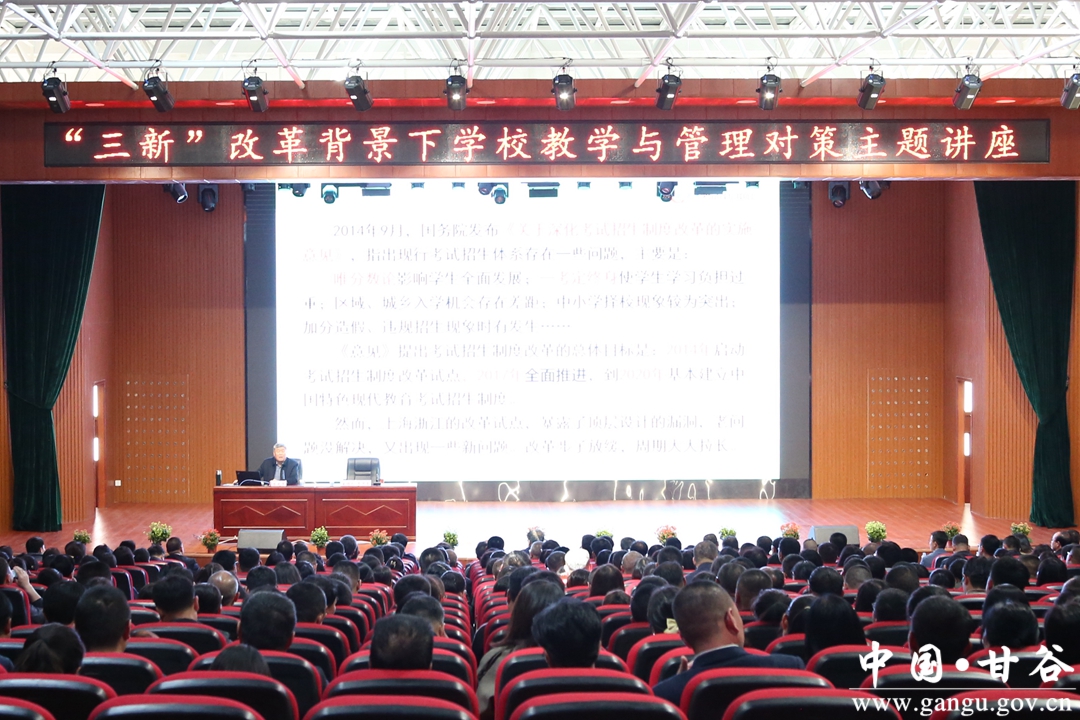 为了适应新形势下课堂教学及高考改革需要,进一步推动全县高中教育新课程顺利实施,帮助学生精准定位学业特长和升学路径,4月16日下午,甘谷县普通高中新课程新高考改革背景下的课堂教学创新主题讲座在甘谷六中新校区格致楼一楼礼堂举办,邀请省教科院特邀专家陈庆军主讲,他就高中“三新”改革背景下学校教学与管理对策作行了详细的分析指导。讲座由县委教育工委书记、县教育局党组书记、局长李果香主持。县教育局班子成员,相关股室负责人,各高中学校党组织书记、校长、分管教学副校长,各高中高一年级、高二年级学科备课组长、科任教师,初中4+6学校部分领导班子共计560余人参加讲座。