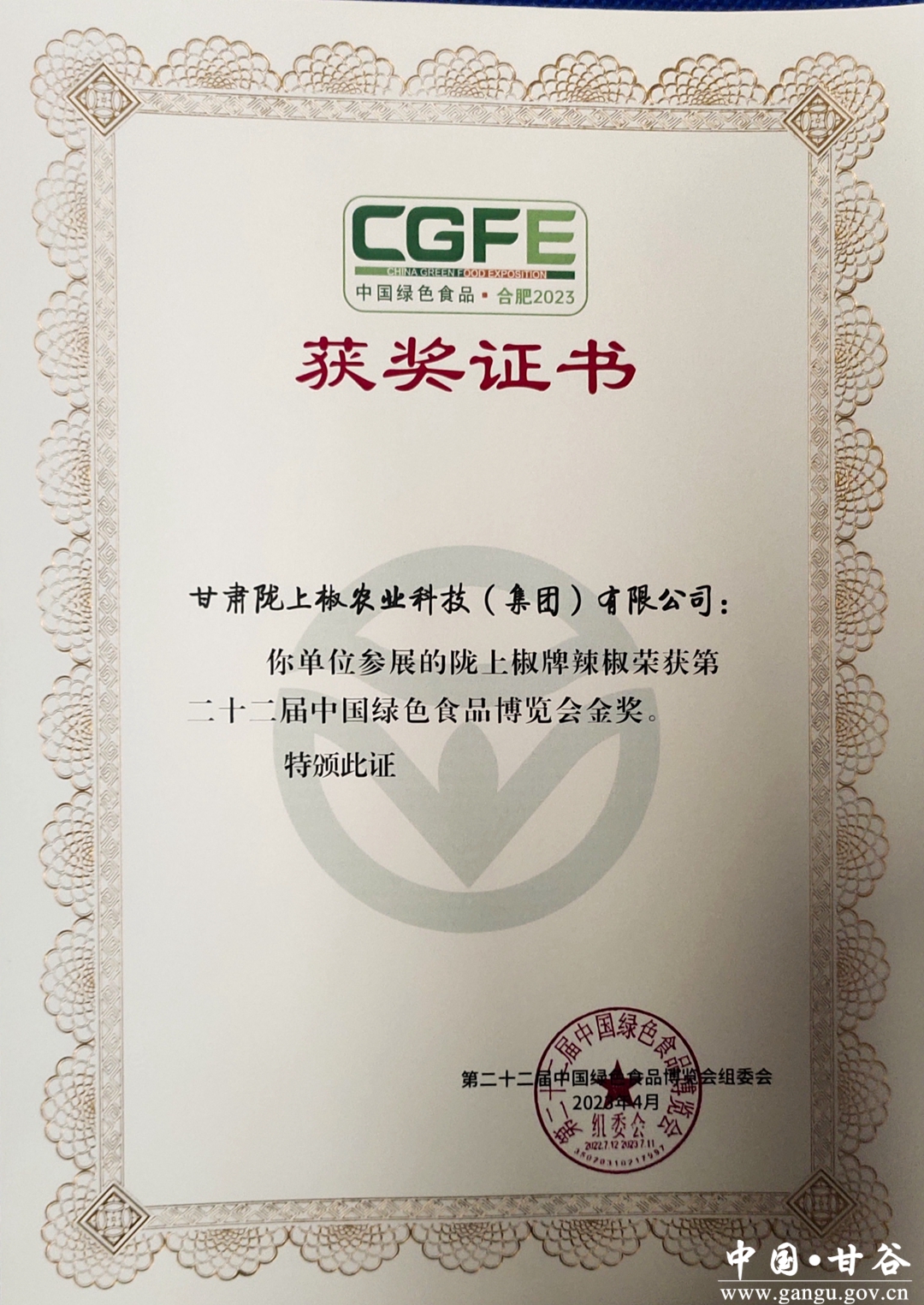 4月16日,记者从甘谷县农业局质量检测中心获悉,3月31日,在农业农村部批准、中国绿色食品发展中心、中国绿色食品协会和安徽省农业农村厅、合肥市人民政府共同主办的第二十二届中国绿色食品博览会暨第十五届中国国际有机食品博览会上,甘谷辣椒绿色食品认证企业甘肃陇上椒农业科技(集团)有限公司参加了展示展销活动,陇上椒选送的辣椒荣获第二十二届中国绿色食品博览会金奖。这也是甘谷辣椒在中国绿色食品博览会上首次获得金奖。