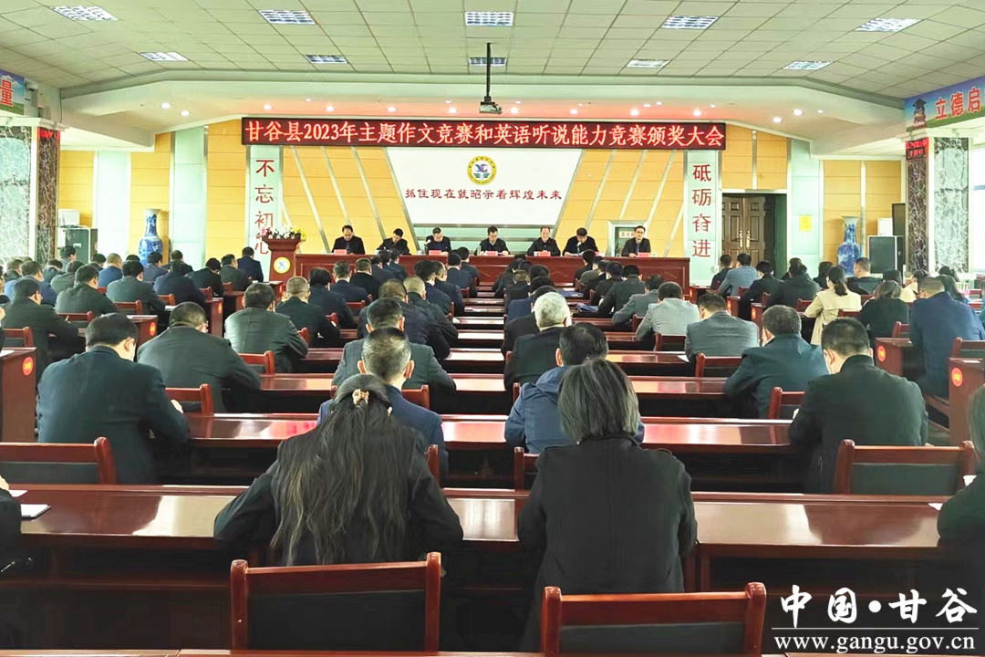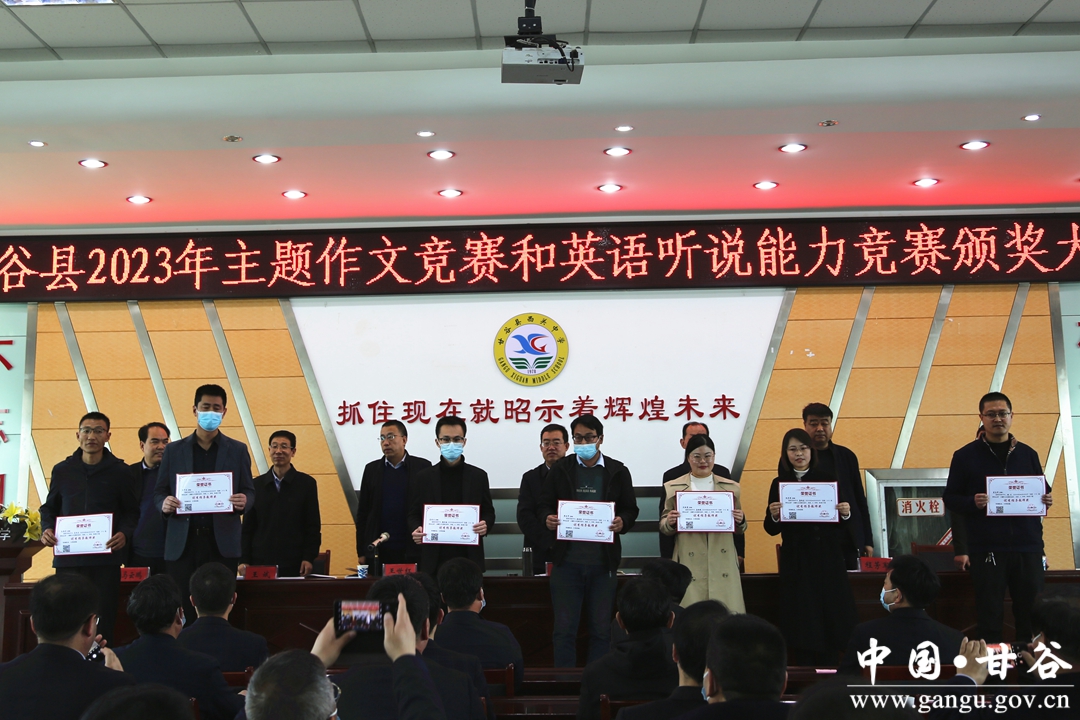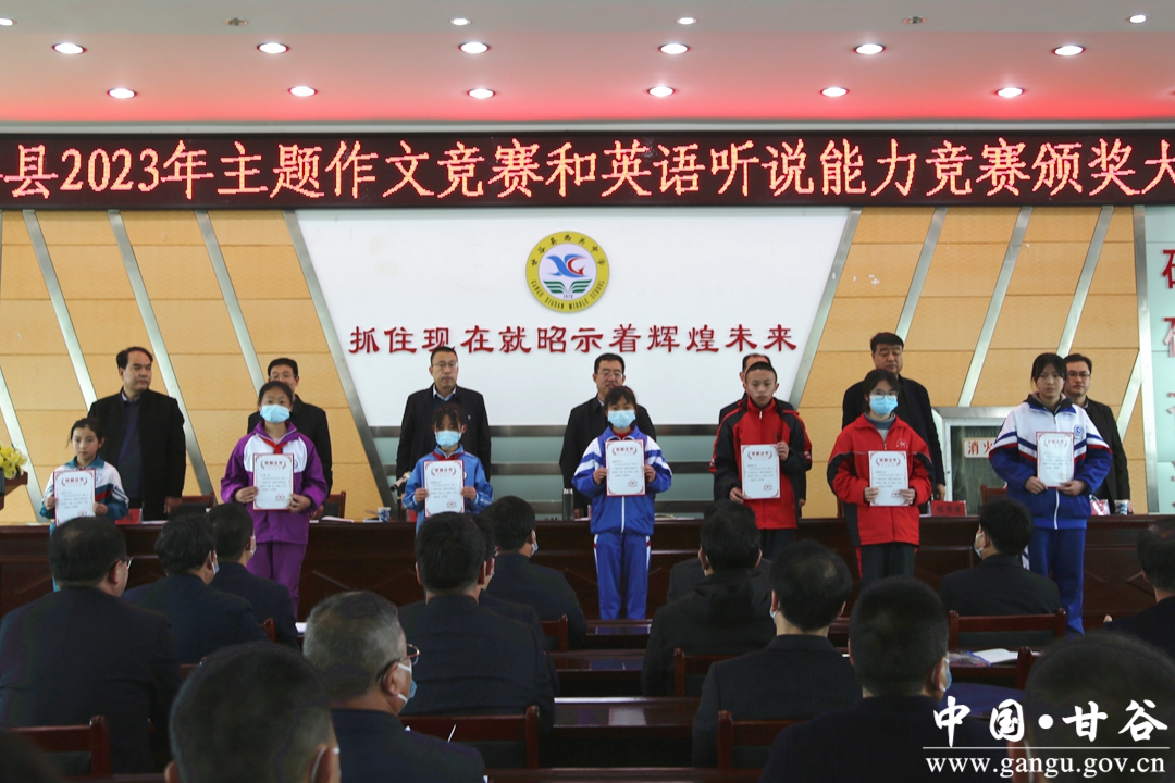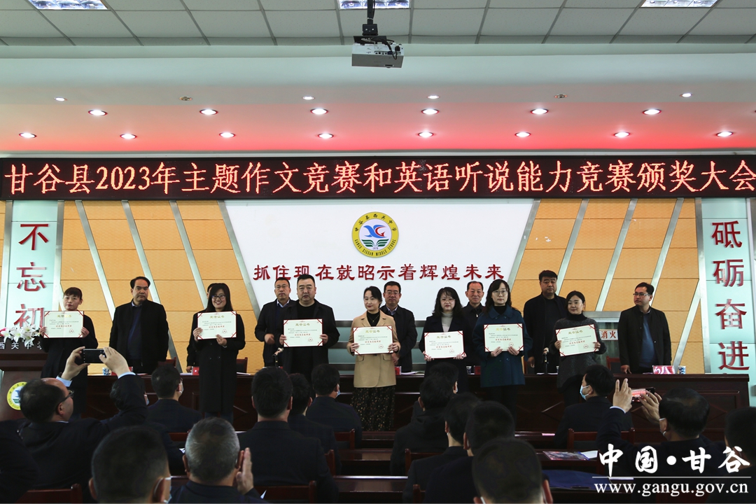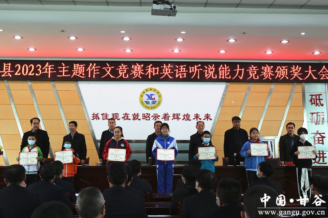 会上,县政府教育督导室专职督学程芳军宣读了作文竞赛和英语听说能力竞赛获奖文件,甘谷一中谢行同学代表主题作文竞赛获奖学生、西关中学张梓桐同学代表英语听说能力竞赛获奖学生、大像山学区杨场小学葛成文老师代表作文指导教师、模范初中何丽霞老师代表英语指导教师依次作了交流发言。