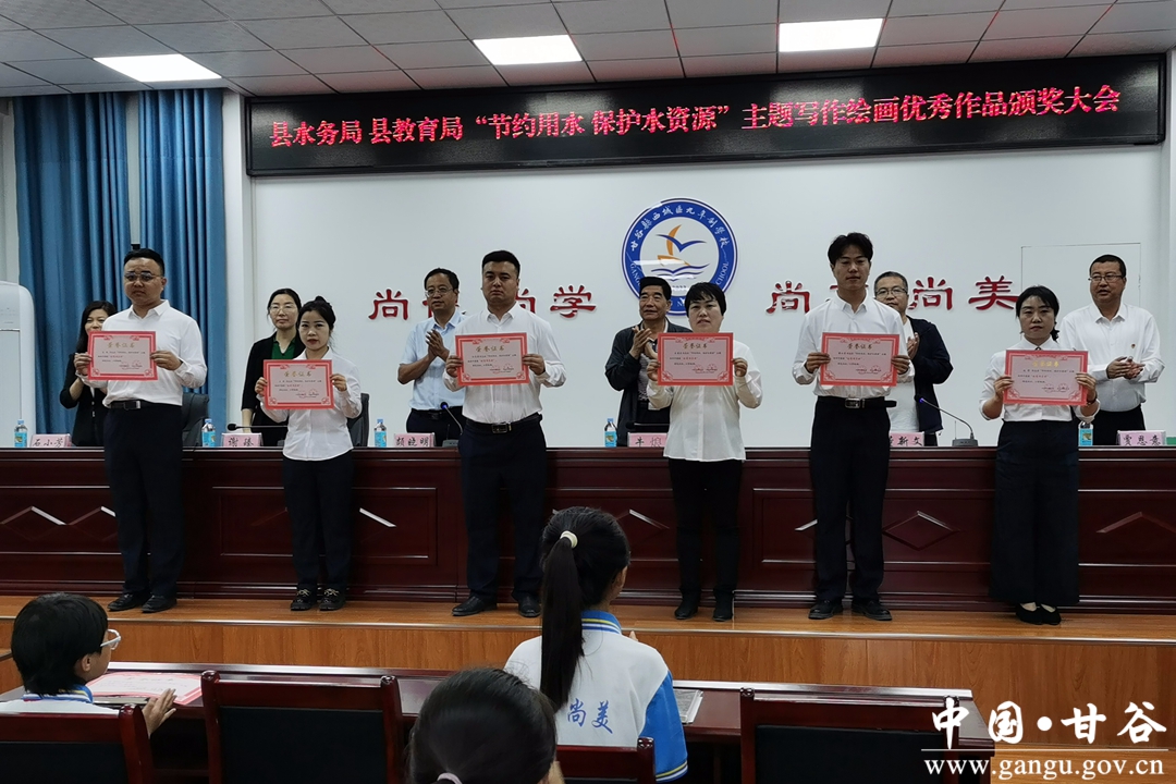活动中,宣传组工作人员和老师们给“节约用水 保护水资源”主题写作绘画活动中获奖的学生和指导老师,颁发了荣誉证书,并观看了学生们创作的作品。