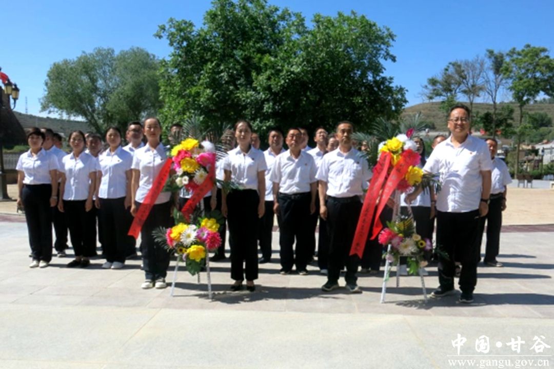 “列队站好,整肃纪律……”音乐声缓缓响起,由2人一组将花篮缓缓抬起,稳步走向以毛泽东为首的第一代中共中央领导人铜像前,公司党总支书记和党员代表上前整理绶带后返回,共同默哀以示崇敬与纪念,敬献花篮仪式结束。之后,由甘谷公司党总支书记带领大家重温入党誓词,铿锵誓言响彻在纪念馆门前久久不息。