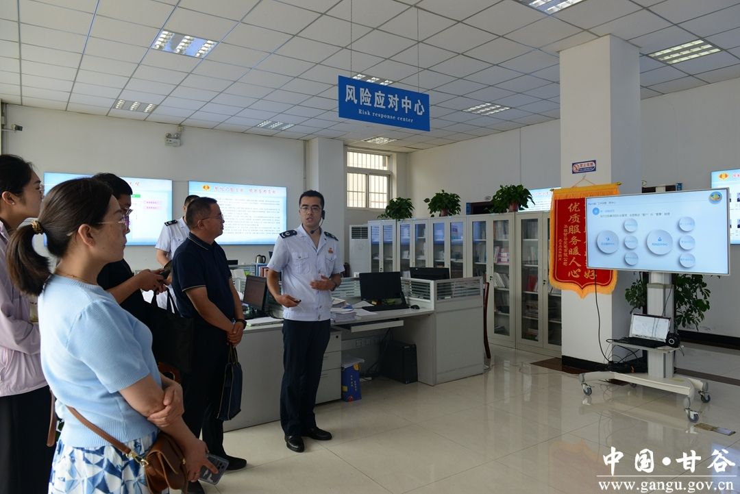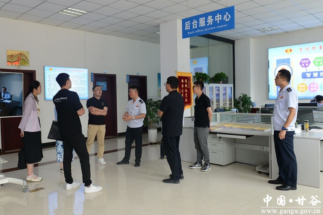 6月27日,张掖市税务局纳税服务科科长赵开勋一行调研甘谷县税务局“两中心、三重构”征管创新工作,天水市税务局党委委员、副局长鲜明,纳税服务中心相关人员陪同调研。