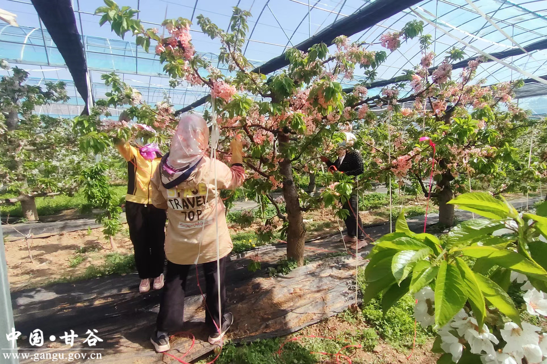 每逢四月,天水丰盈大樱桃种植基地都会成为一片花的海洋,如今,这里的樱桃迎来了盛花期,万紫千红的花朵竞相绽放,将整个园区装点得如诗如画,果农们忙碌着进行疏花、授粉、除草等花期管护。在果园中可以看到,搭建的多防篷最为醒目,遮阳网配合防雨布遮盖能起到防晒防高温的作用,可以促进果树坐果和果实膨大。