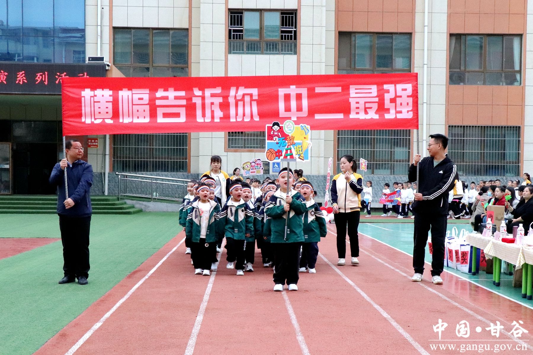 器械操展示活动在激情澎湃的《超级宝贝》音乐声中拉开帷幕。接下来由各班组成的沙锤、有声体操环、花棍、手摇花、花球、红旗等器械操竞相登场,孩子们喊着气势磅礴的口号,跟着激扬的音乐,踏着矫健的步伐、干脆利落地将中华武术的精、气、神充分展现出来。他们认真、自信、充满朝气地表演,丰富多彩的节操形式赢得大家的阵阵掌声。