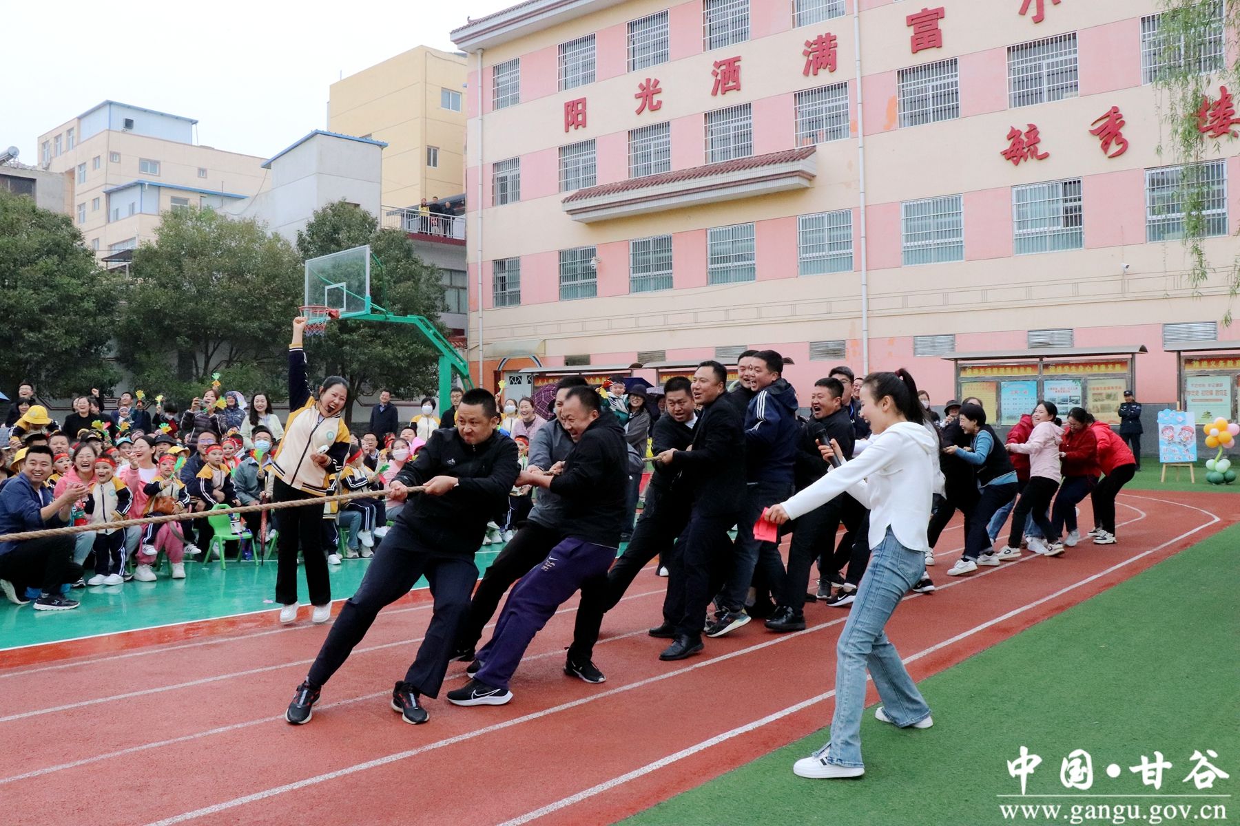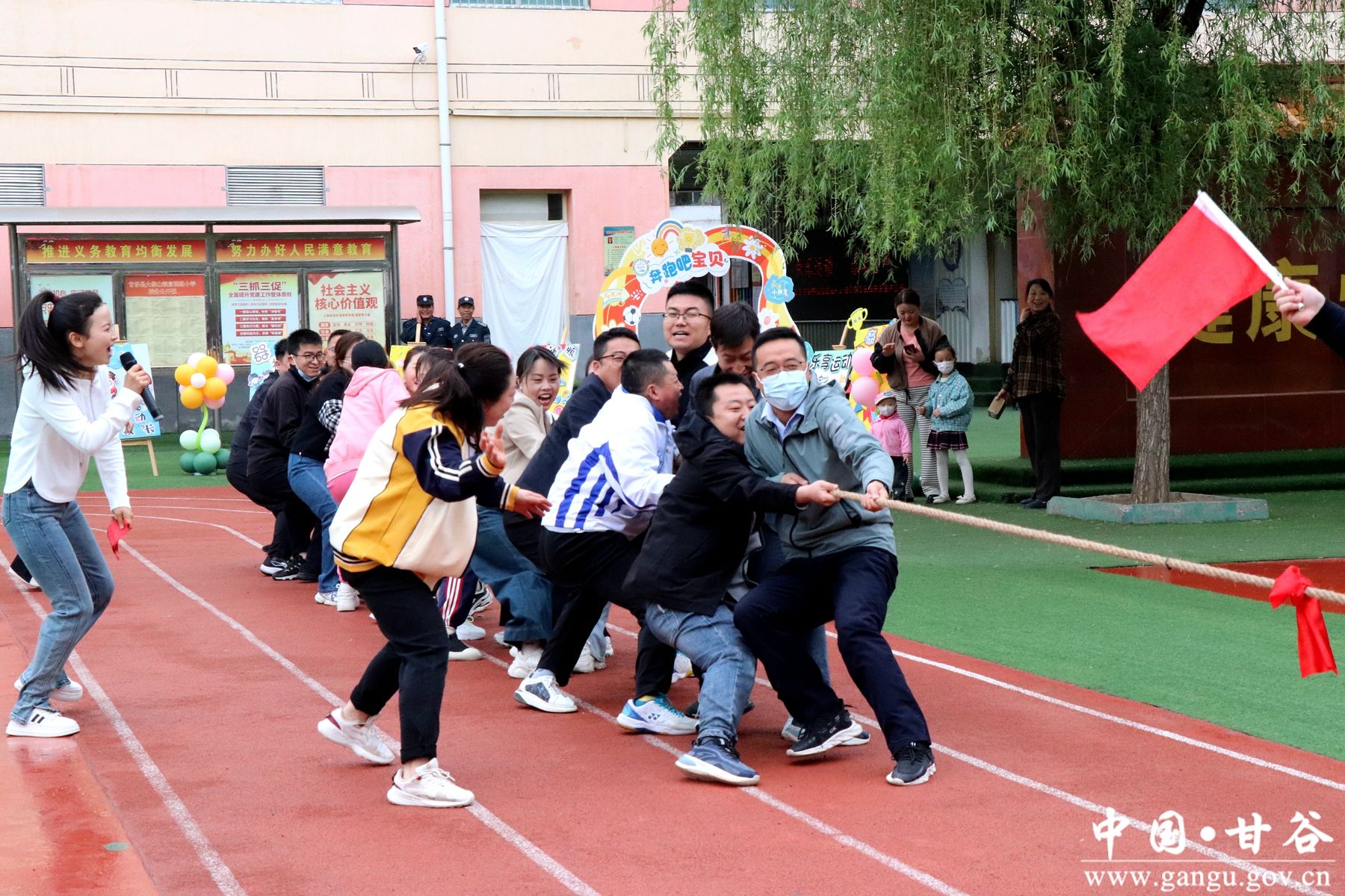 “加油加油”!在震耳欲聋的高喊声中,集体“拔河”比赛开始了,爸爸妈妈们代表班级参赛,伴随着裁判老师清脆的哨声,比赛正式开始,宝爸们一个个都涨红了脸,双手握紧长绳,牙关紧咬,身体后倾脚蹬地,使足了劲拼命往后拉,现场的气氛热烈而高涨,助威声此起彼伏。给所有人带来了一场别开生面的拔河比赛的盛宴和精神鼓舞。