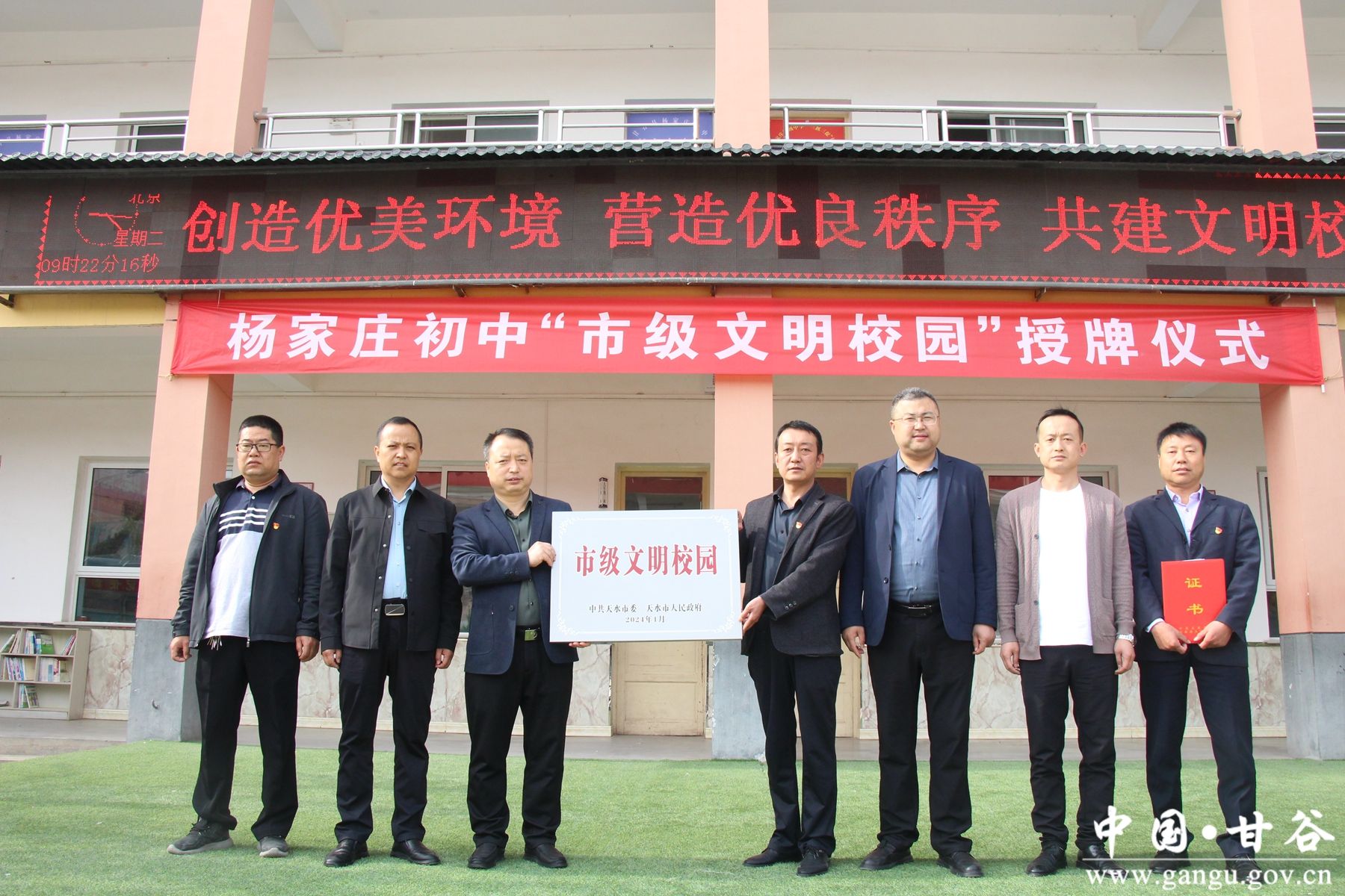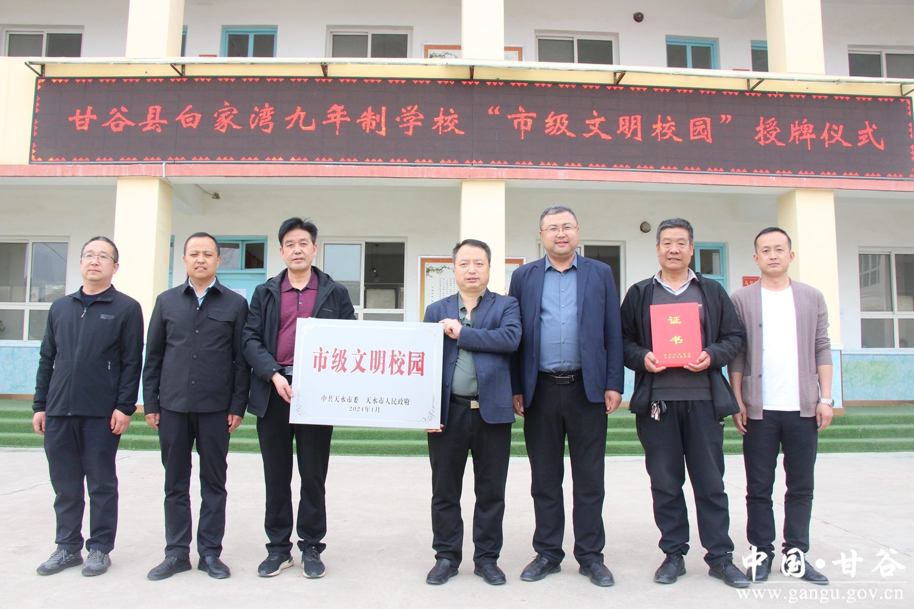 新甘谷讯【通讯员 魏红艳】近日,甘谷县为获得第五届市级文明校园的学校进行授牌。县委宣传部、县文明实践办负责人先后赴白家湾乡白家湾九年制学校、礼辛镇礼辛小学、西坪初级中学、杨家庄初级中学等学校进行现场授牌并颁发荣誉证书。此前,大像山镇富强路小学、八里湾初级中学已在全市精神文明建设大会上集体授牌。
