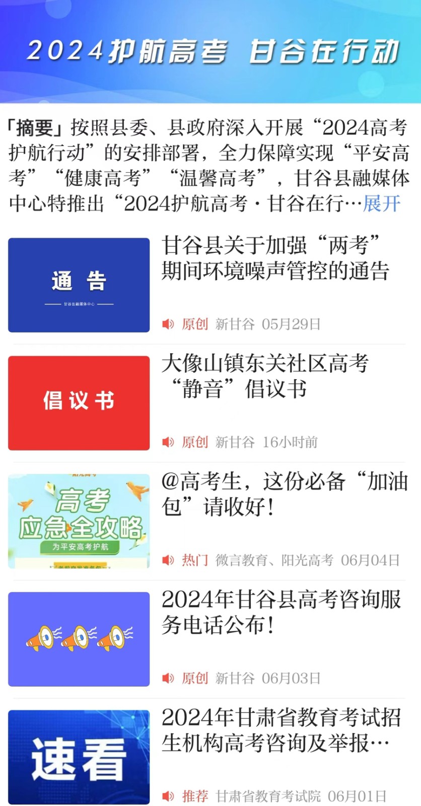 甘谷县融媒体中心在新甘谷客户端开设了“2024护航高考·甘谷在行动”专栏,重点围绕高考综合改革和考试招生领域广大考生关心关切,考生们可以轻松获取到最新的高考咨询信息,包括考试组织、政策宣传、咨询服务、志愿填报、通告公告、温馨提示等内容,积极为考生和家长提供权威的政策咨询和细致的考试服务。
