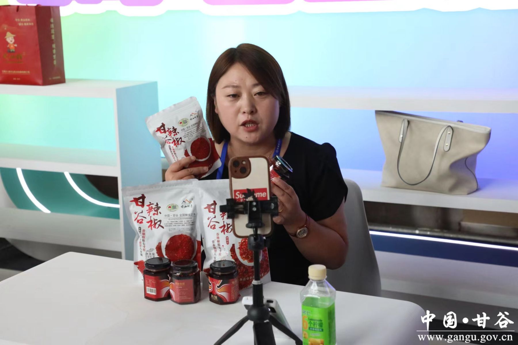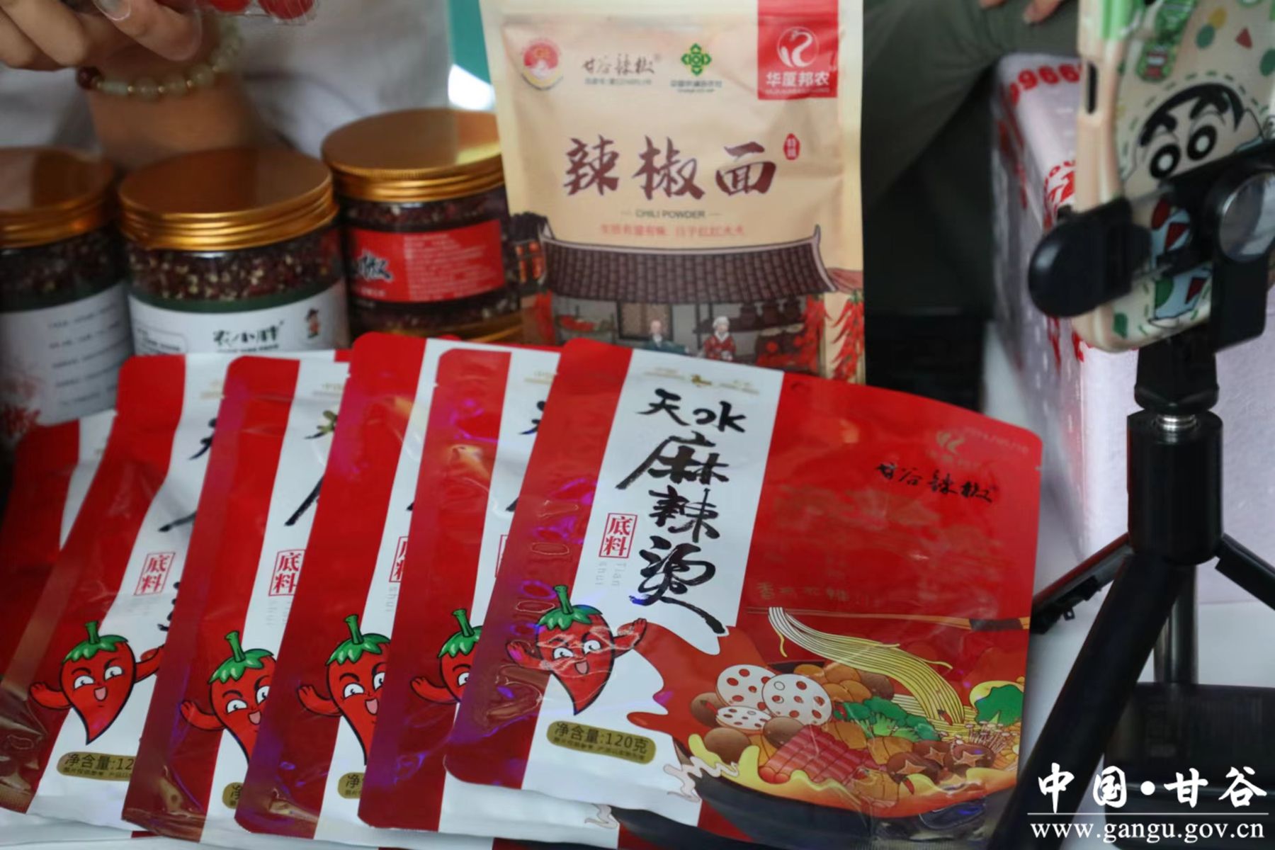 在直播带货活动现场,可以看到来自甘谷县像山印象电子商务有限公司、天水润谷农业科技发展有限公司、甘肃农小胖农业科技发展有限公司三家网货品牌企业的主播,正热情洋溢对着镜头介绍着自家特色的农副产品,只见主播一手辣椒面,一手辣椒酱,正详细向观众介绍每个产品的原料配料、口感特色、价格优惠等内容,并通过现场展示、聊天互动等环节,全方位、多角度地让观众了解甘谷辣椒传统的制作工艺及其独特的香辣口感,更是详细为网友们提供了一份如何炸制辣椒油、如何制作地道麻辣烫等“保姆式”的使用指南。生动的描述,近距离的展示、贴心的服务引得网友纷纷在直播间下单购买。