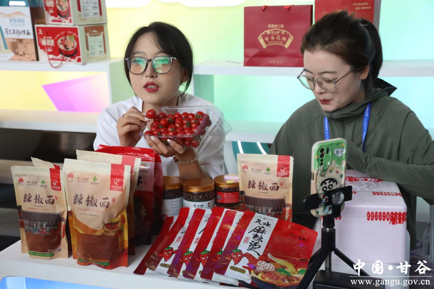 展厅内设有互动打卡及直播区等多个板块,省内各市州、县区招商部门、企业都在此开展线上招商推介和网货品牌企业直播带货活动,吸引了众多群众前来浏览消费。其中甘谷辣椒、花椒、粉条、玲珑小番茄等多种极具特色的农副产品广受群众欢迎,刚开播,观看人数便不断上涨,线上购买的顾客也络绎不绝。