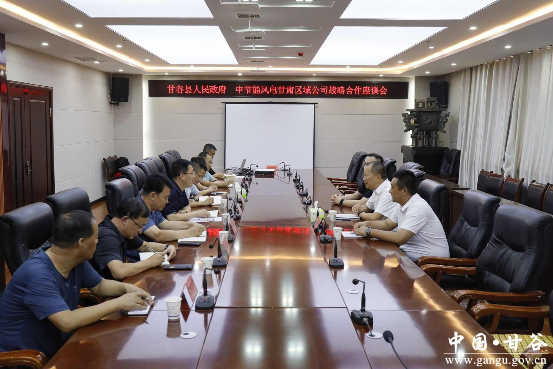 座谈会上,与会双方观看了甘谷县宣传片和中节能风电甘肃区域公司宣传片。杨亮对牛小伟一行的到来表示欢迎。他说,甘谷区位优势明显,风力资源充沛,消费市场广阔,是企业投资兴业的热土。中节能风电公司实力雄厚、技术先进,希望公司充分发挥自身优势,在风力发电及民生建设等领域开展全方位合作,把更多先进技术、高端项目、创新模式布局在甘谷,助力甘谷现代化建设。甘谷县政府将全力提供良好的政策环境、高效的服务保障,与中节能风电甘肃区域公司携手共进,推动双方合作迈向更高水平。