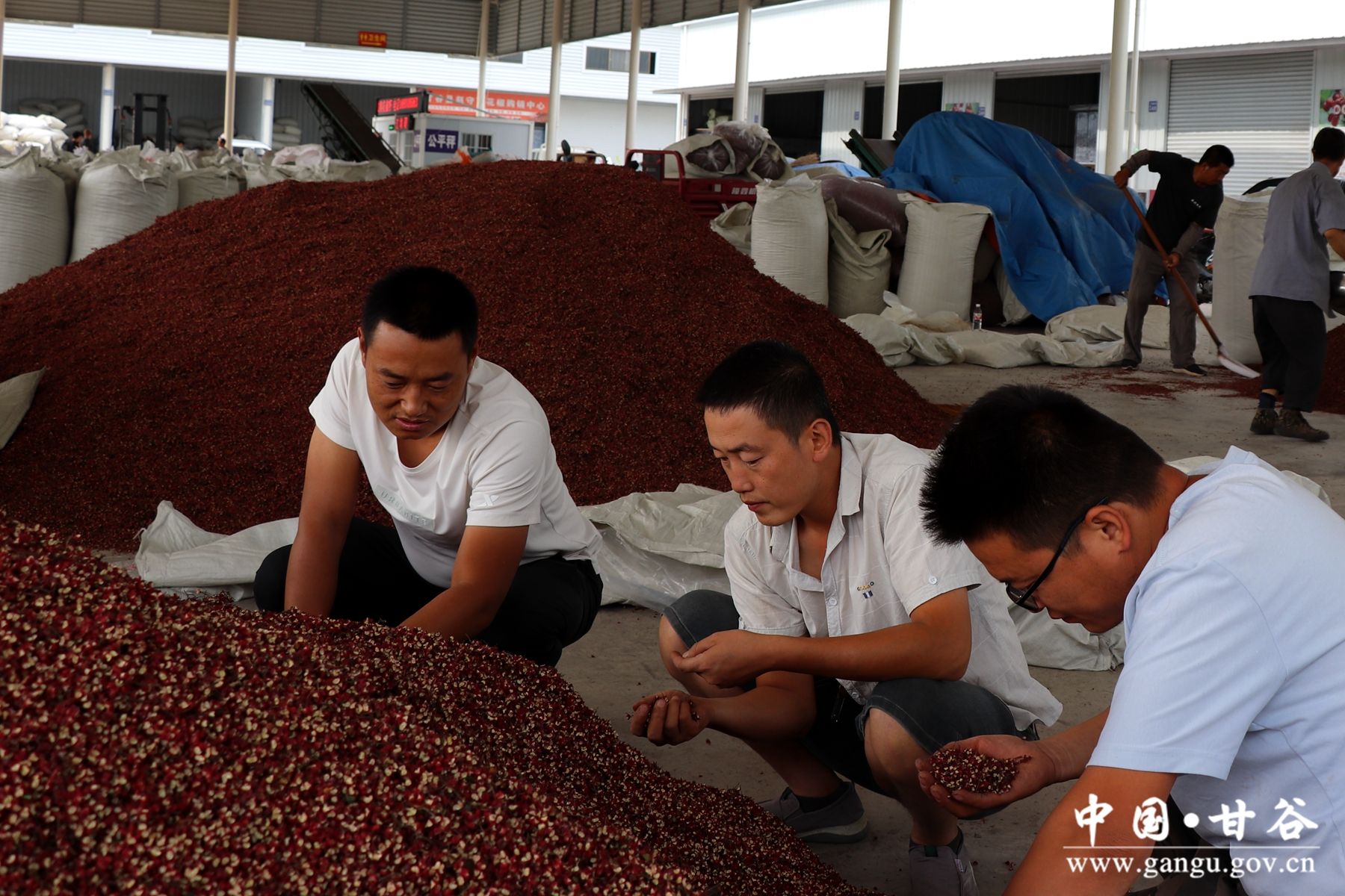 甘谷县六峰镇是甘谷花椒的主产地,产出的大红袍花椒色红味浓、粒大肉厚,备受消费者青睐。一大早,甘谷县六峰镇的花椒集散交易中心里就人头攒动,欢声笑语,来自全国各地的采购商在这里仔细察看花椒品质、与椒农商量价格、过秤交易,现场气氛十分火热。来自四川绵阳的花椒商人周志勇告诉记者,他每年都来甘谷采购花椒,今年就在六峰的交易市场发现了许多好货。