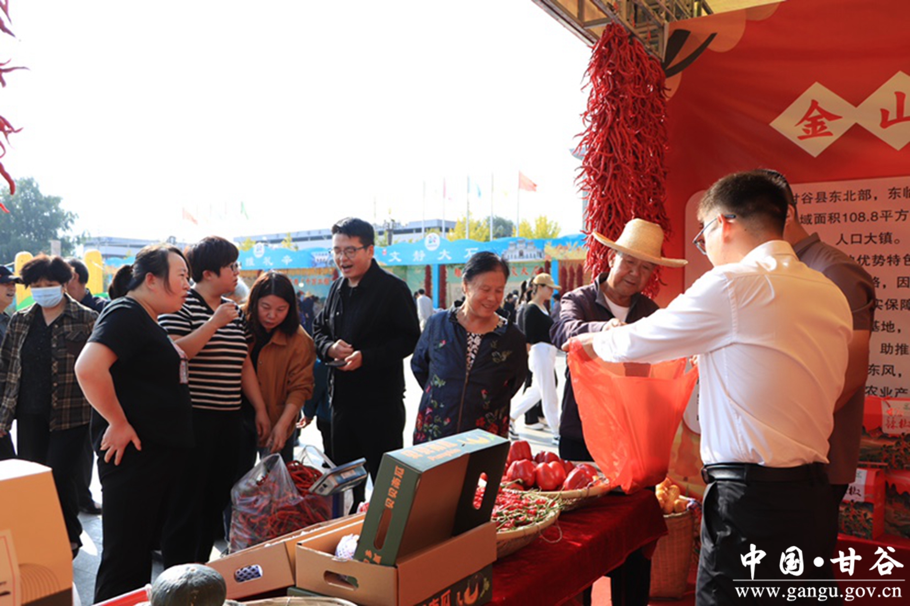 在丰收节活动现场,金山镇展出了红红火火的七寸红辣椒、质地柔嫩的西门塔尔牛肉、小巧玲珑的贝贝南瓜、酸甜可口的浪漫红颜和阳光玫瑰葡萄、营养丰富的杂粮……琳琅满目的特色农产品吸引了诸多朋友驻足,工作人员热情地为前来品尝了解的朋友讲解介绍,尤其是七寸红辣椒受到了众多消费者的青睐,大家争相购买,赞不绝口。此次活动期间,金山镇的辣椒销量达3000多斤。