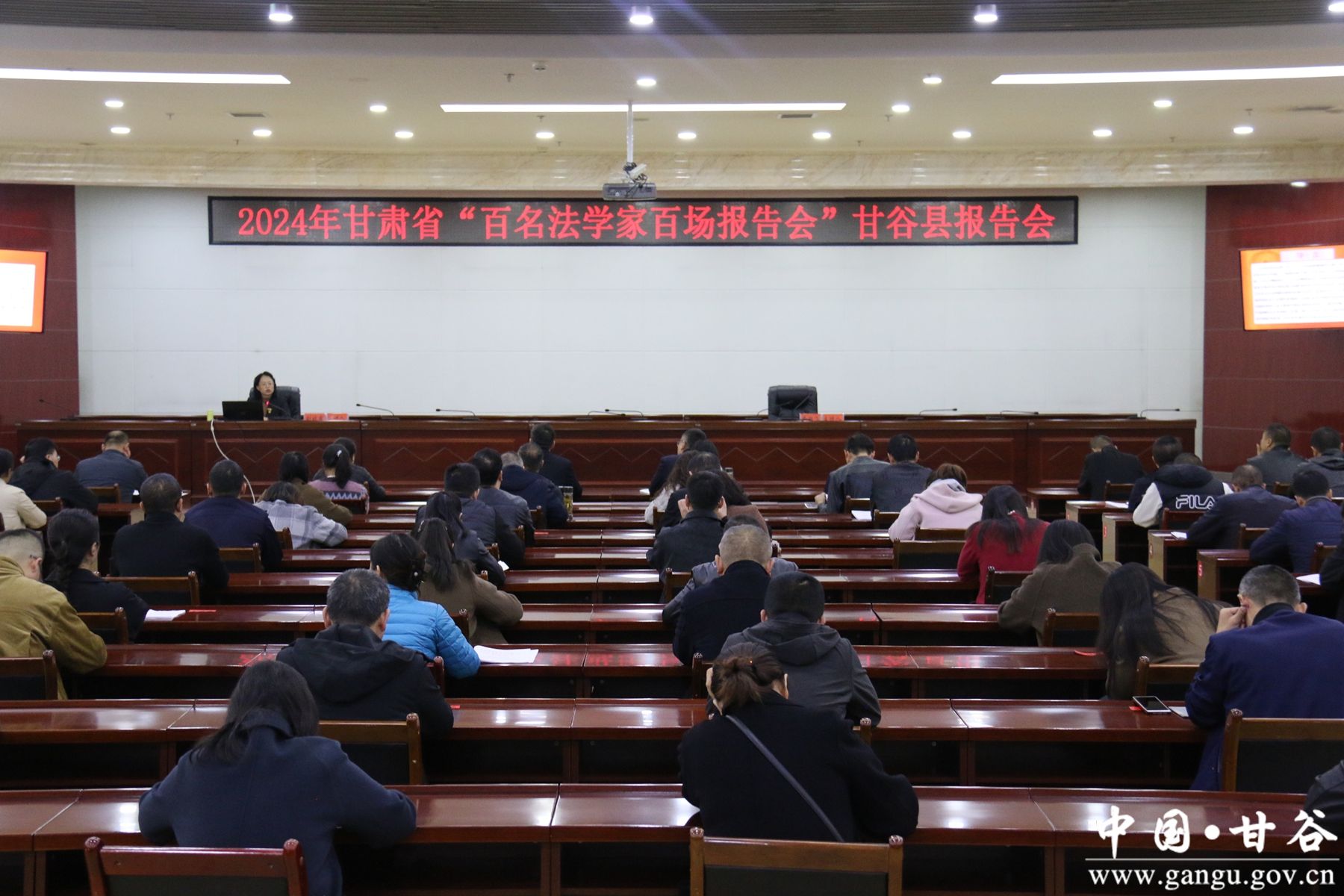 新甘谷讯 近日,2024年甘肃省“百名法学会百场报告会”甘谷县报告会举行。甘肃政法大学民商经济法学院教授刘晓霞作宣讲报告,副县长、县公安局局长李羽飞主持宣讲会。党群系统主要领导、政府部门及驻县单位、政法系统主要负责人、各乡镇党委副书记等共计140余人参加。