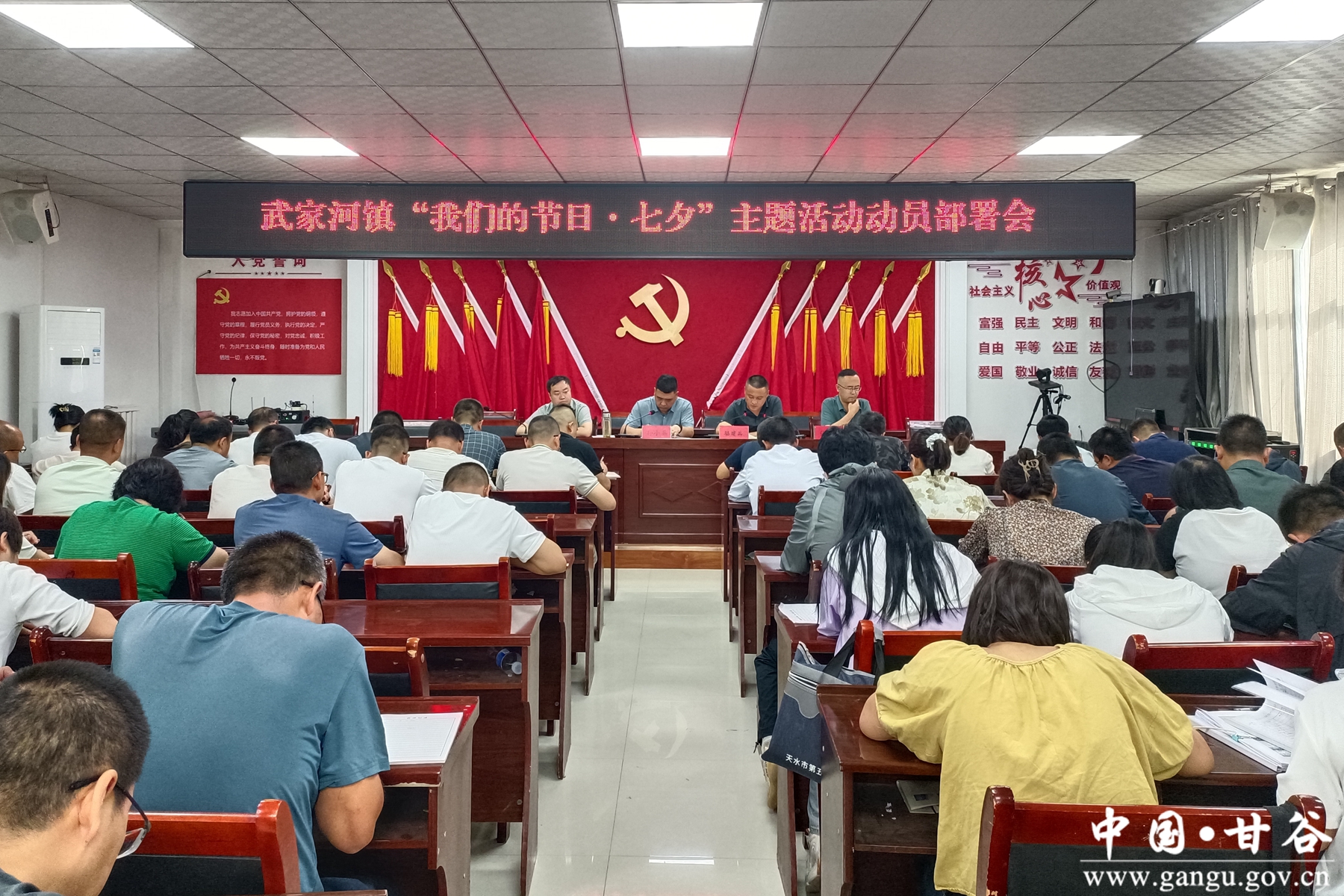 8月5日,武家河镇召开“我们的节日·七夕”主题活动动员部署会。会议宣读了《甘肃省“抵制高额彩礼 倡导文明婚俗”倡议书》,动员全体镇村干部践诺年初签订的“抵制高价彩礼 推进移风易俗”承诺内容。并面向全镇干部群众发出倡议:一要自觉抵制高额彩礼,坚决拒绝以彩礼论身价、以彩礼保婚姻、以婚敛财、嫁女解困等扭曲观念,积极鼓励“低彩礼、零彩礼”;二要倡导简约适度婚俗理念,坚决反对婚礼宴席大操大办、铺张浪费、盲目攀比、炫富摆阔等不良风气,划清传统习俗与陈规陋习界限,移“歪风”,除“陋俗”;三要大力倡导“风雨同舟、相濡以沫、责任担当、互敬互爱”婚姻关系,培育立家规、传家训、正家风的家庭意识,弘扬孝老爱亲、敦亲睦邻、勤俭持家的传统美德。