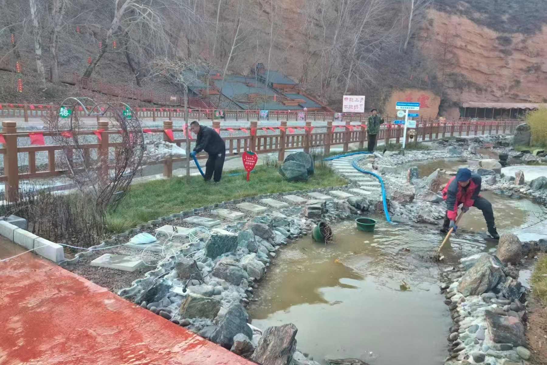 景区环境提质效。虽然冬季进镇游客减少,但凤旋溪景区日常保洁工作并未松懈,村组干部、公益性岗位人员定期清扫景区内的曲水流福、“灵风耸翠”主题广场、点将台等特色小景观区域,打捞河道中的漂浮物,保持水体清澈,去除枯枝败叶,让景区内的花草树木始终保持良好的生长状态,为未来游客的到来营造更加优美宜人的景区环境。