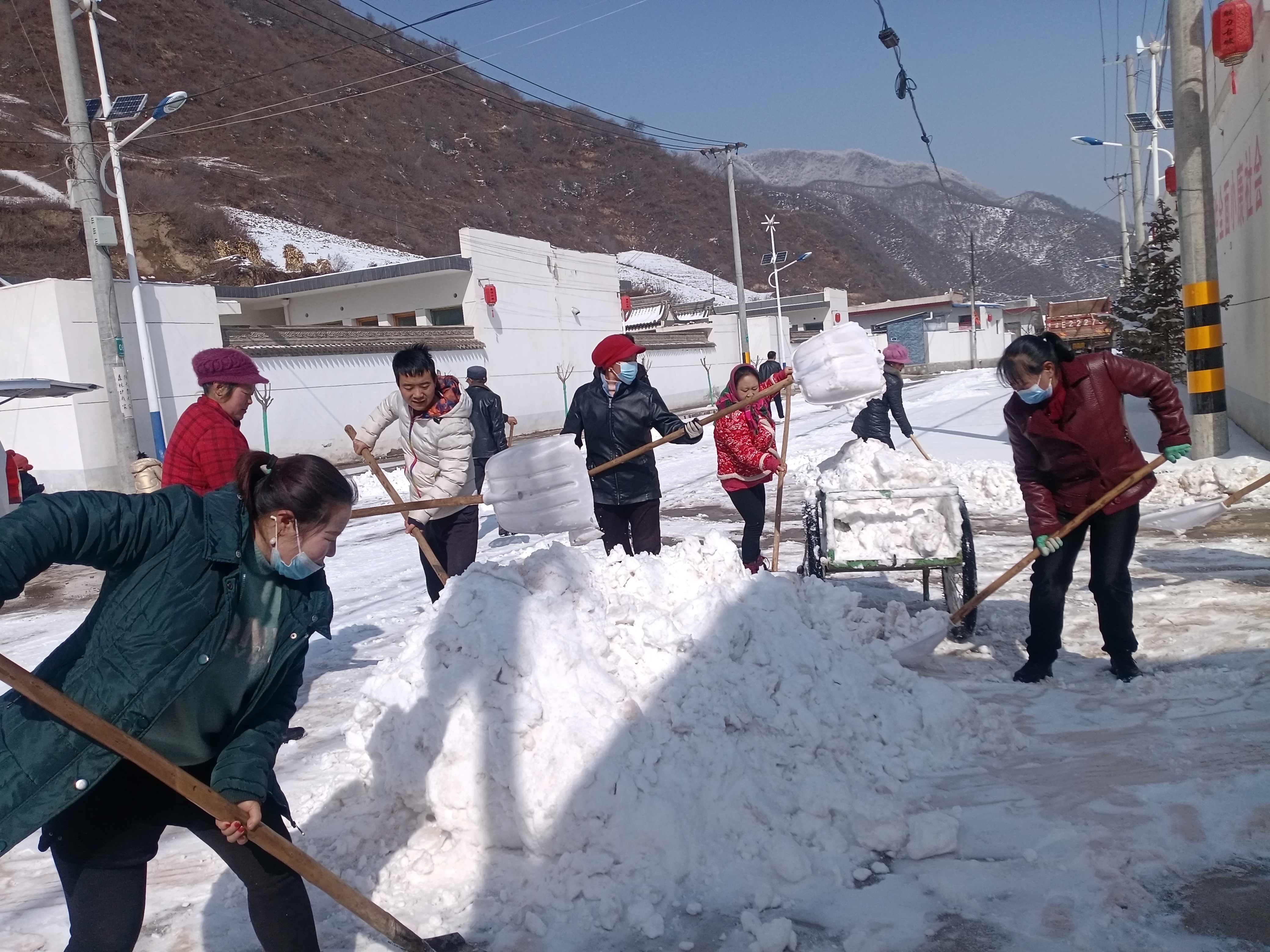 党员齐带头,冲在前,干在先。为全方位、无死角清理道路积雪和冰层,广大党员干部带领群众按照“先主干道后背街小巷”的原则,对山区主干道、辖区陡坡、弯道、桥梁等重点区域的积雪进行了清扫。天气虽寒冷,但所有人干劲十足、热情高涨、各自挥舞着扫雪工具,扫的扫,铲的铲,推的推,忙得不亦乐乎。