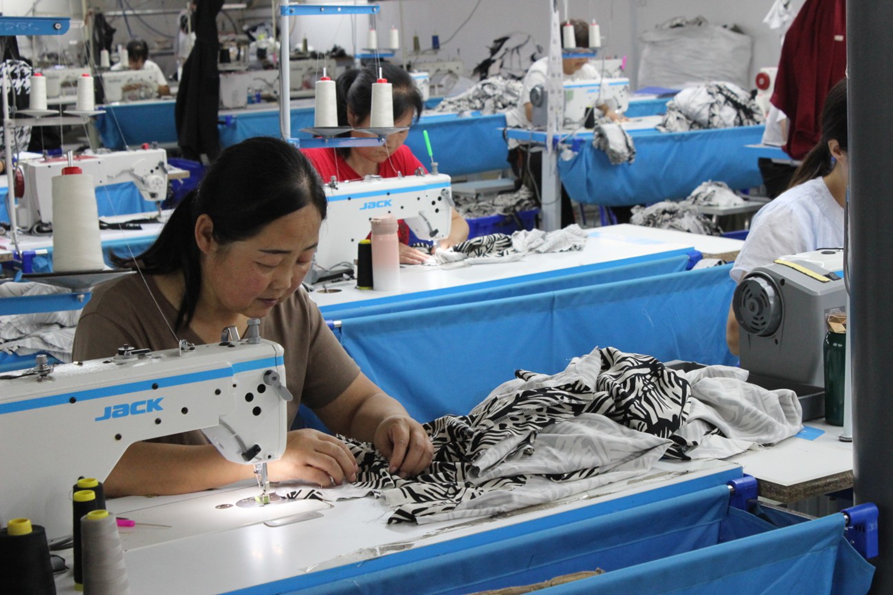 “嗒嗒嗒”,还未踏进大门,就已经听到了热闹的缝纫机运作声,这里就是位于磐安镇东街村的鑫惠源服饰有限公司。迎着日光走进厂房,映入眼帘的是几十位工人埋头忙碌的身影,她们有的在裁剪台前勾勒线条,有的不断挪动拼接着手中的布料,不出一会儿,几块零散布料就被缝制成一件女装短袖,工人们在认真制衣的同时也会时不时聊上几句,传来阵阵欢笑声。新衣特有的清香和欢快的氛围让服装厂的每一寸空间都涌动着勃勃生机,也藏着“新农人”在政策扶持下返乡创业的激情与担当。