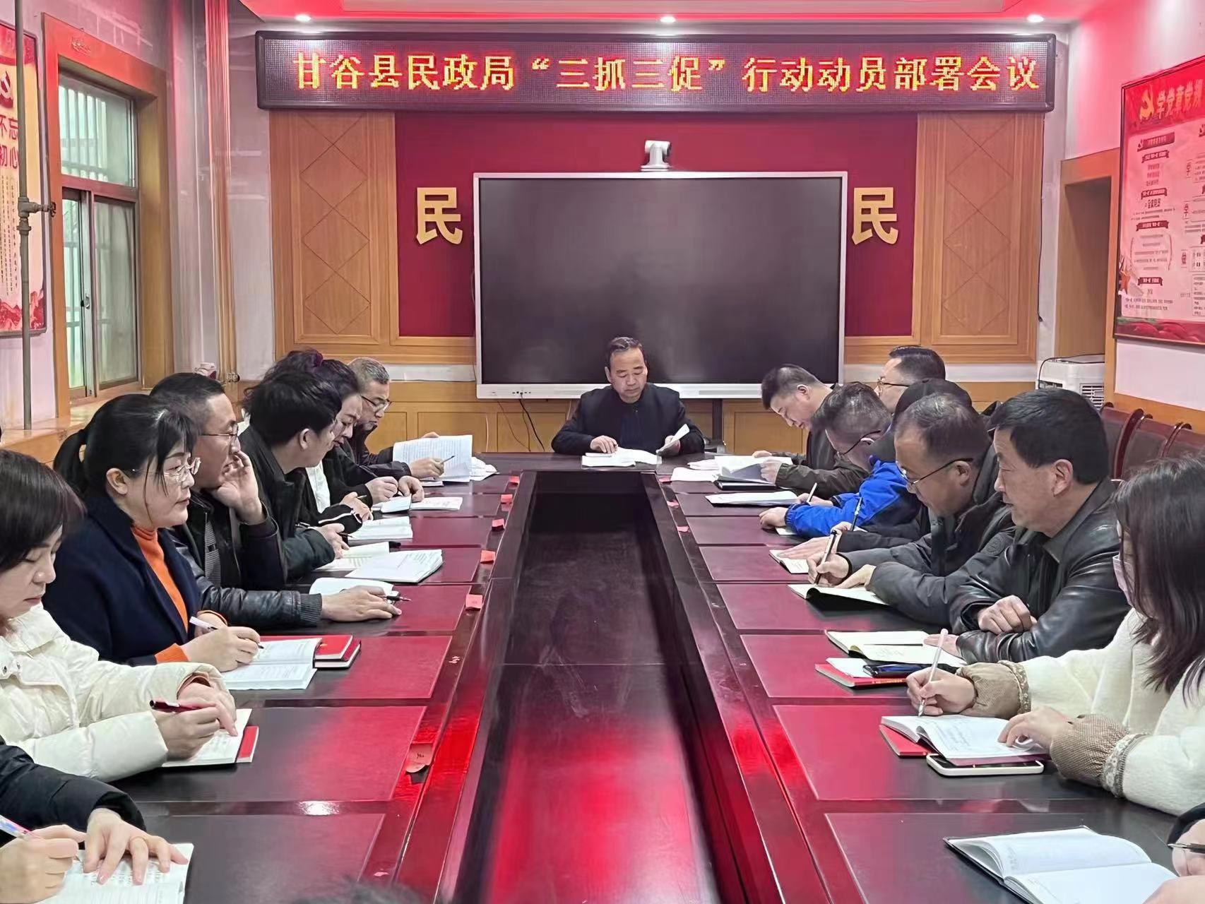 会议传达学习了省、市、县委“三抓三促”动员部署会议和全县“三抓三促”行动领导小组办公室主任会议精神,宣读了《甘谷县民政局“抓学习促提升抓执行促落实抓效能促发展”行动实施方案》,并对全县民政领域开展“三抓三促”行动作出了安排部署。