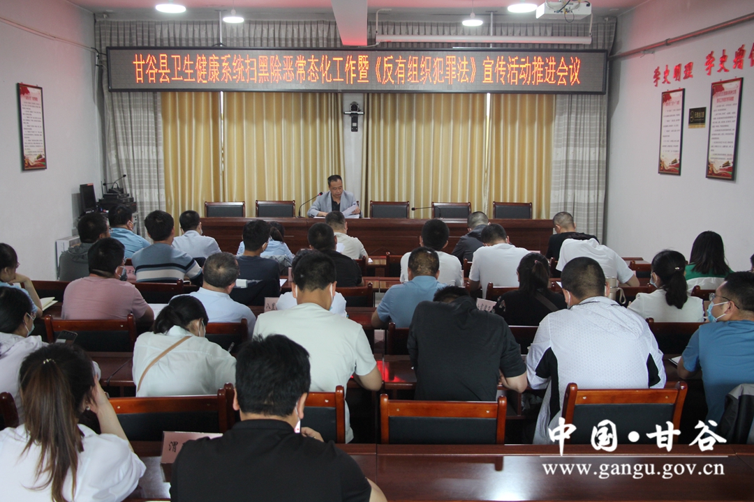 为认真落实全国、省、市扫黑办关于切实抓好《反有组织犯罪法》学习贯彻实施的要求,全面理解和把握《反有组织犯罪法》主要内容,5月24日,甘谷县卫生健康系统组织召开扫黑除恶常态化工作暨《反有组织犯罪法》宣传活动推进会议。县直各医疗卫生单位、各乡镇卫生院负责人,局机关相关股室负责人参加了会议。