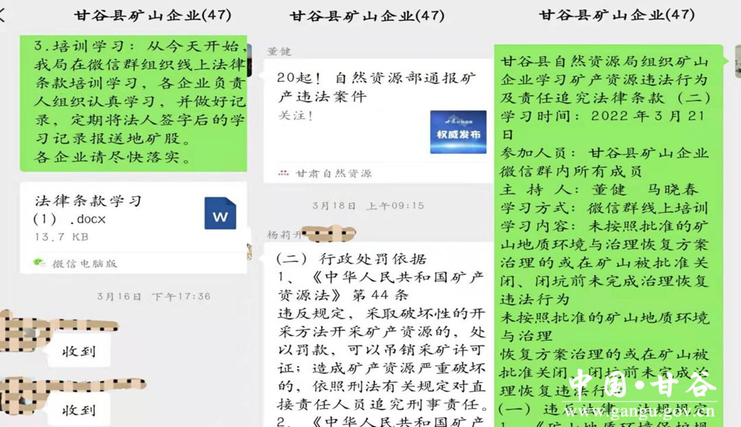 为了注重培训实效,结合本地实际和员工特点,引导各企业人员通过碎片化时间进行自主化学习,我局本着针对性强、简明扼要、方便实用的原则,整理了矿产资源管理相关法律法规学习资料,内容主要包括采用破坏性开采方法开采矿产资源违法行为、未按照批准的矿山地质环境与治理恢复方案治理的或在矿山被批准关闭、闭坑前未完成治理恢复违法行为、超越批准矿区范围采矿的违法行为等七种违法行为,从违反法律法规规定、行政处罚依据、行政处罚裁量标准、刑事追责依据等几个方面,结合矿产违法案例进行了线上培训,并要求各企业认真学习,上报法人签字后的学习记录。