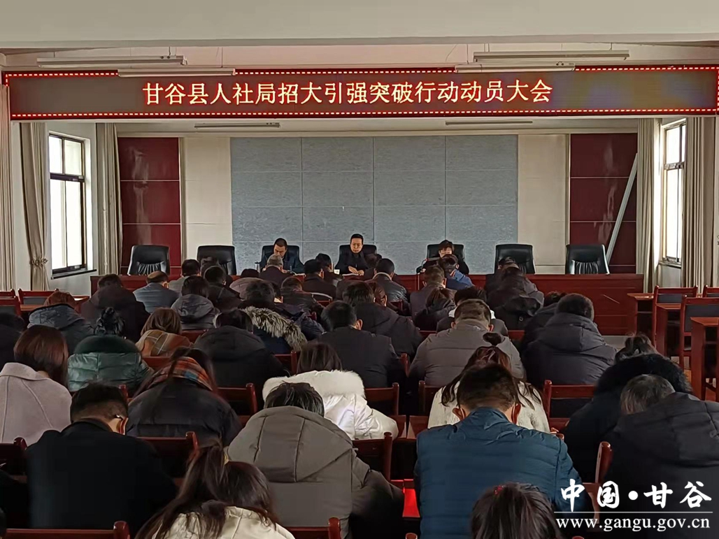 会议书面传达了全县招大引强突破行动动员大会精神,宣读了《甘谷县人力资源和社会保障局招大引强突破行动实施方案》。