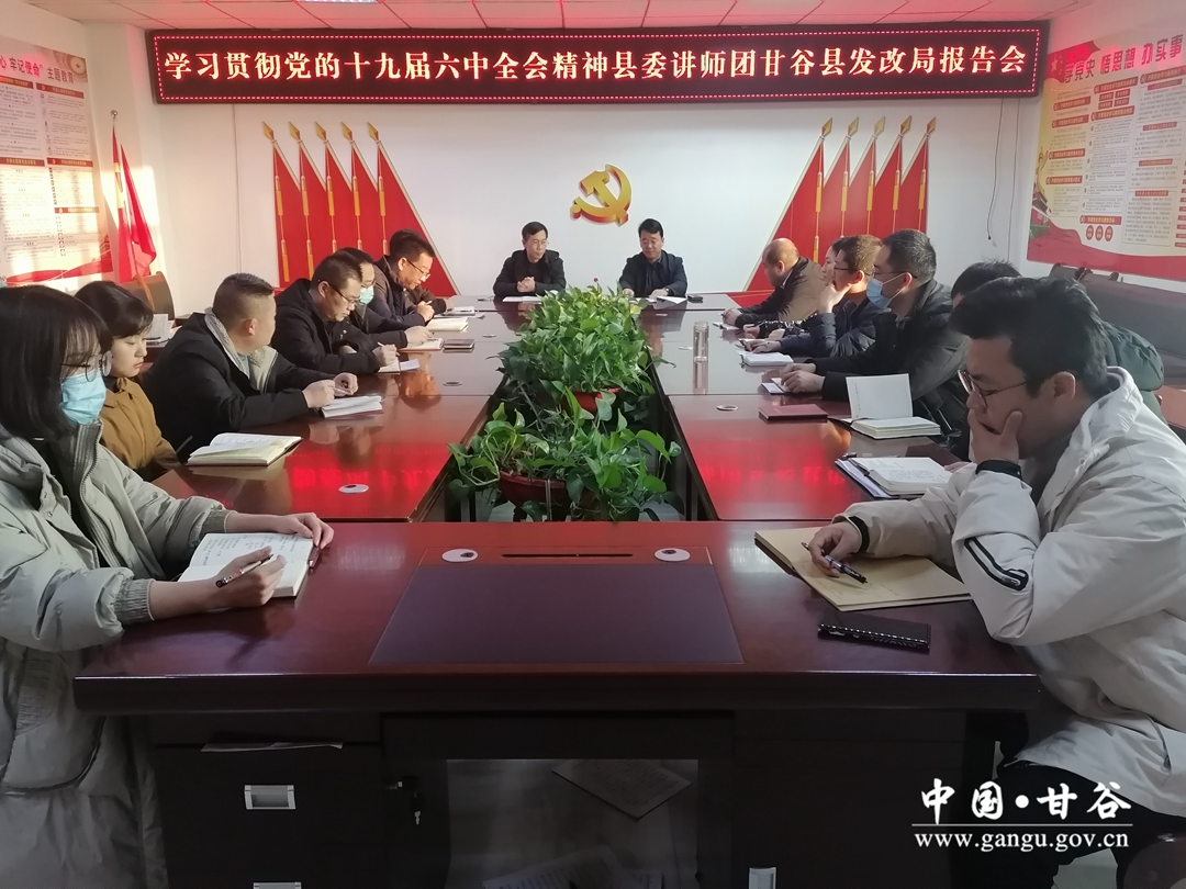 为深入贯彻落实党的十九届六中全会精神,12月24日,甘谷县发展和改革局举办学习贯彻党的十九届六中全会精神宣讲报告会,邀请县委讲师团成员、甘谷四中教师李建军做了题为“以史为鉴,接续奋斗,走好新时代赶考路”的专题宣讲,局党组书记、局长刘晓明同志主持会议,全体干部职工参加会议。
