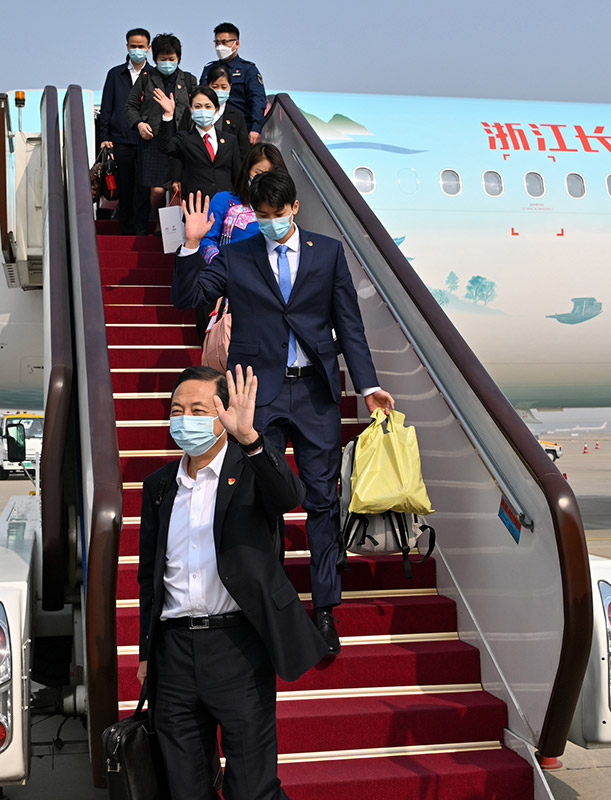 10月14日,来自浙江省的党的二十大代表乘飞机抵达北京首都国际机场。新华社记者 陈益宸 摄