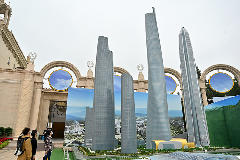 10月8日,观众在室外展区观看中国建造的超高建筑集锦模型,以上海中心大厦、深圳平安国际金融中心、重庆陆海国际中心等标志性城市建筑组成的集群,集中展现绿色智慧建造理念和技术,充分体现“中国建造”以日新月异的城市建设为人民拓展幸福空间的使命任务。新华社记者 李鑫 摄