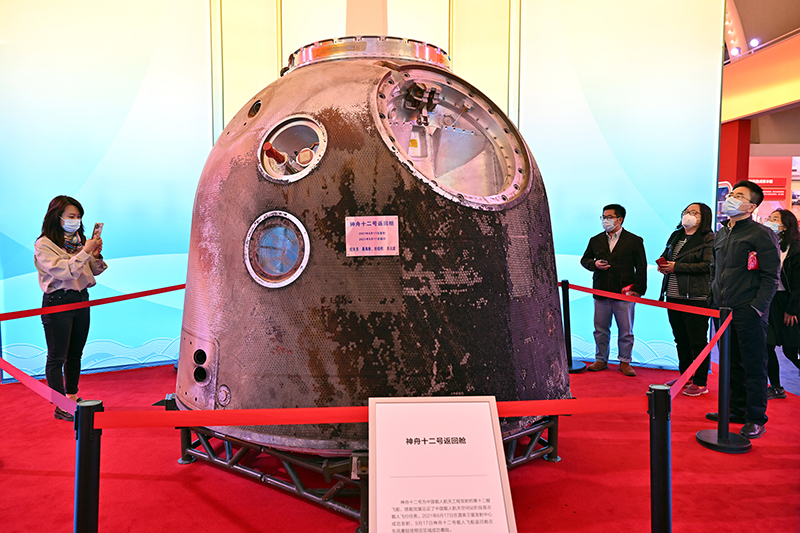 10月8日,观众参观拍摄神舟十二号返回舱。新华社记者 李鑫 摄