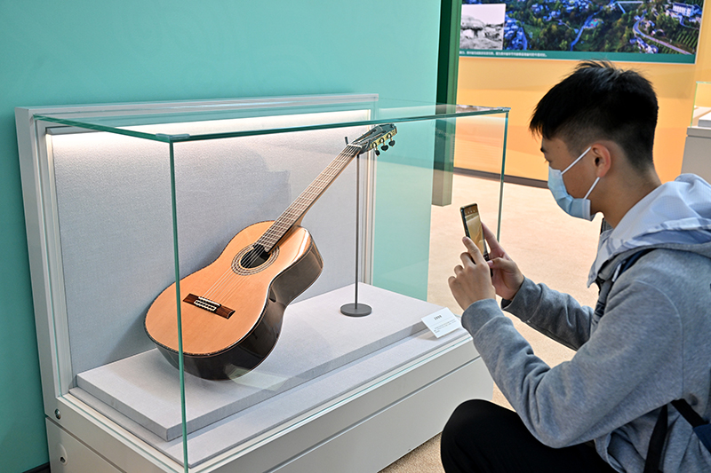 10月8日,一名观众在贵州展区拍摄正安吉他。贵州省正安县目前已成为全球最大吉他生产基地,已带动近15000人在家门口就业、6000余人稳定脱贫。新华社记者 李鑫 摄