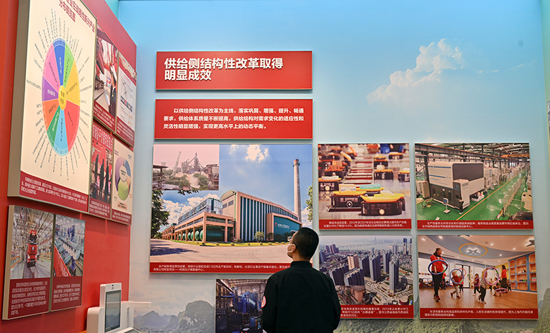 10月8日,一名观众在中央综合展区内观看供给侧结构性改革取得明显成效的展览内容。新华社记者 李鑫 摄