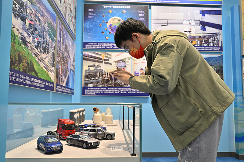 10月8日,一名观众在吉林展区拍摄中国第一汽车集团有限公司自主品牌汽车模型。新华社记者 李鑫 摄