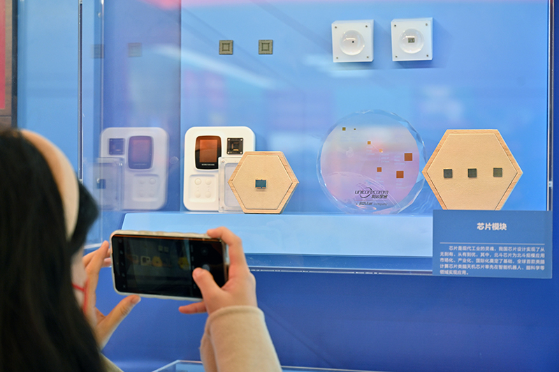 10月8日,一名观众拍摄名为“方寸之间”的陈列墙上的芯片模块展示。新华社记者 李鑫 摄