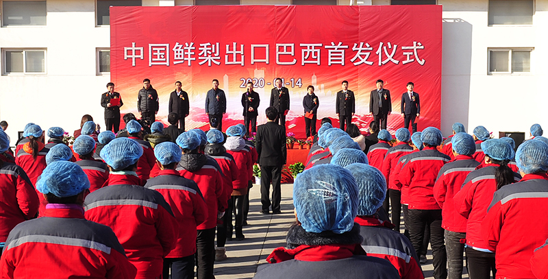 2020年1月14日,中国鲜梨出口巴西首发仪式在河北沧州泊头举行。新华社记者 牟宇 摄