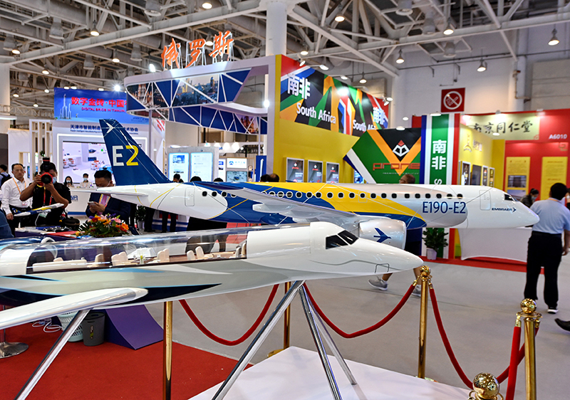 参观者从2021金砖国家新工业革命展展出的飞机模型前走过(2021年9月8日摄)。新华社记者 林善传 摄