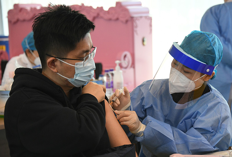 2021年12月7日,北京市海淀区上地街道组织医护人员来到海国瑞业科技园,为园区内的企业员工进行新冠疫苗加强针接种。新华社记者 任超 摄