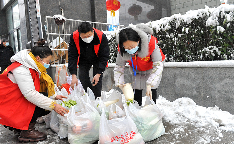 1月22日,在河南省安阳市建安社区一小区门口,社区工作人员在打包配送物资,准备为部分老人、居家隔离人员、行动不便人员等送货上门。新华社记者 韩朝阳 摄