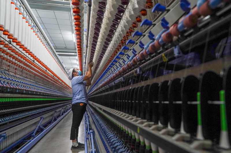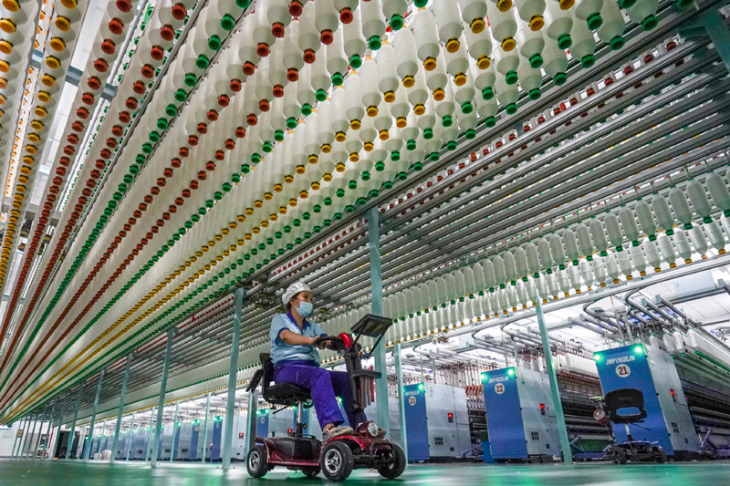 纺织工人在江苏大生集团有限公司数字化纺纱车间内作业(10月26日摄)。新华社记者 李博 摄