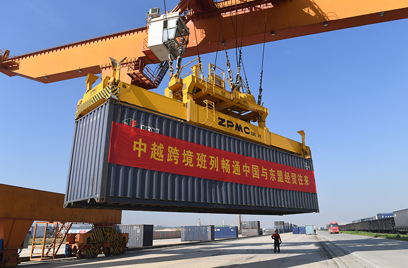 在广西南宁国际铁路港,工人在吊装中越跨境班列货物集装箱(2020年11月11日摄)。新华社记者 陆波岸 摄