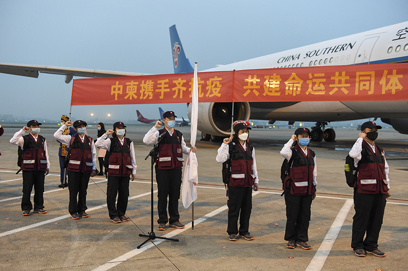 在南宁吴圩国际机场,广西壮族自治区卫健委选派的抗疫医疗专家组启程前往柬埔寨(2020年3月23日摄)。新华社记者 曹祎铭 摄