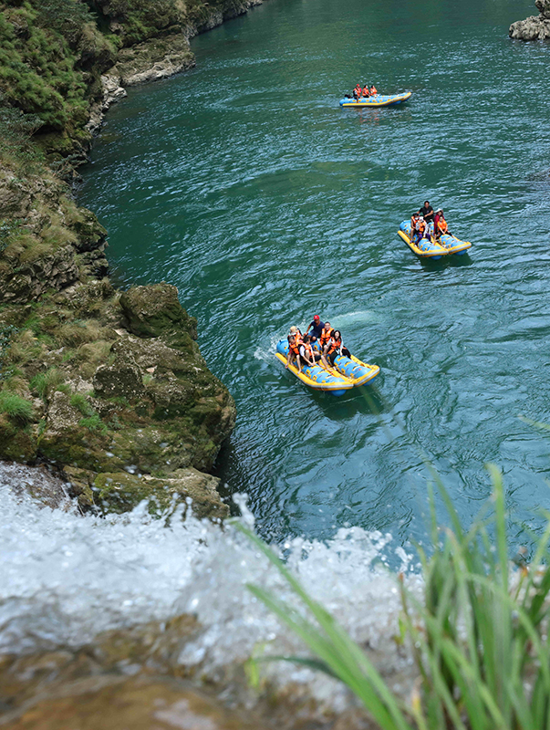 10月3日,游人在湖南省张家界市茅岩河风景区体验水上漂流项目。新华社发(吴勇兵摄)