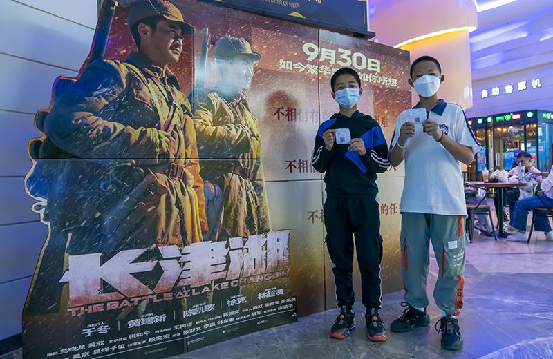 在昆明一家电影院,观众在电影《长津湖》展板前合影(10月1日摄)。新华社记者 陈欣波 摄