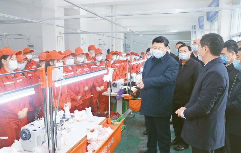 2020年4月20日至23日,中共中央总书记、国家主席、中央军委主席习近平在陕西考察。这是4月21日,习近平在安康市平利县老县镇锦屏社区考察社区毛绒玩具厂,了解搬迁群众就业情况。新华社记者 鞠鹏/摄
