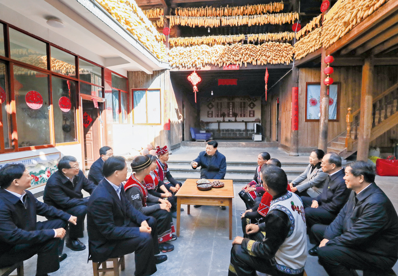 2020年1月19日至21日,中共中央总书记、国家主席、中央军委主席习近平来到云南,看望慰问各族干部群众,向全国人民致以新春祝福。这是19日下午,习近平在腾冲市清水乡三家村中寨司莫拉佤族村,同村民李发顺一家聊家常,详细询问脱贫情况。新华社记者 鞠鹏/摄