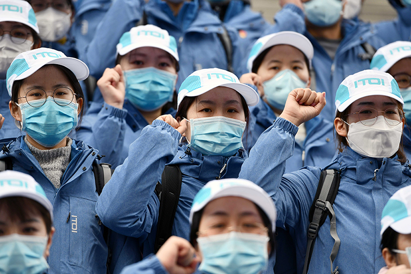 2020年2月9日,在山东济南,山东大学第二医院支援湖北抗疫国家医疗队中的党员在出发前重温入党誓词。新华社记者 朱峥 摄