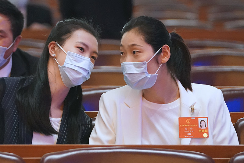 5月28日,第十三届全国人民代表大会第三次会议在北京人民大会堂举行闭幕会。这是闭幕会前,全国人大代表朱婷(右)和张常宁在交谈。