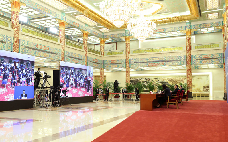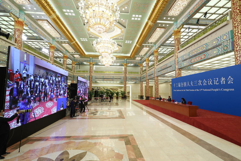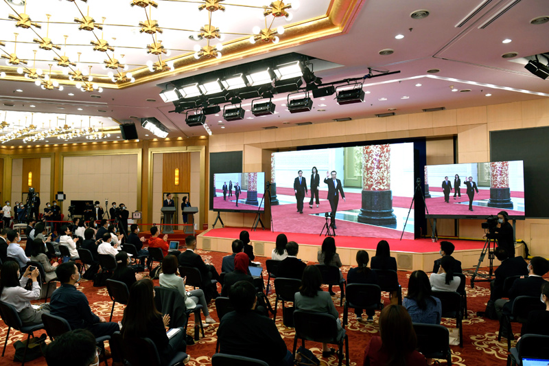 5月28日,国务院总理李克强在北京人民大会堂出席记者会并回答中外记者提问。这是记者在梅地亚中心多功能厅采访。