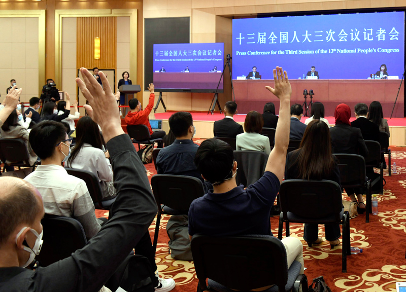 5月28日,国务院总理李克强在北京人民大会堂出席记者会并回答中外记者提问。这是记者在梅地亚中心多功能厅举手提问。