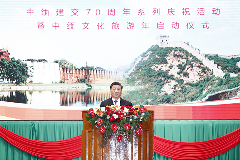 当地时间1月17日晚,国家主席习近平在内比都第二国际会议中心出席中缅建交70周年庆祝活动暨中缅文化旅游年启动仪式。这是习近平在仪式上致辞。新华社记者 刘彬 摄